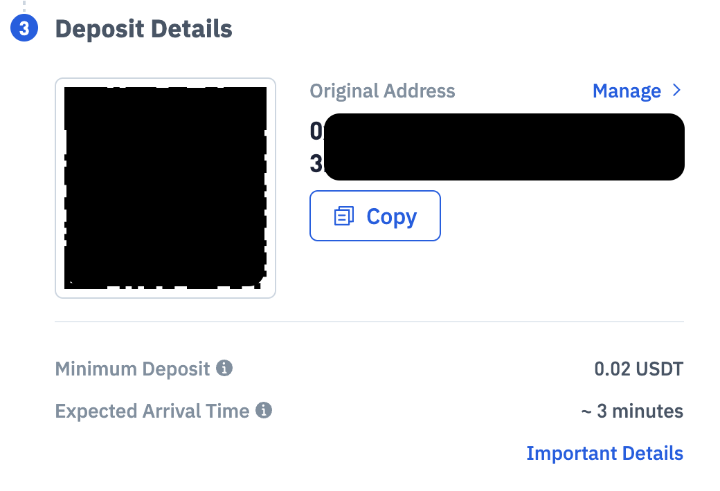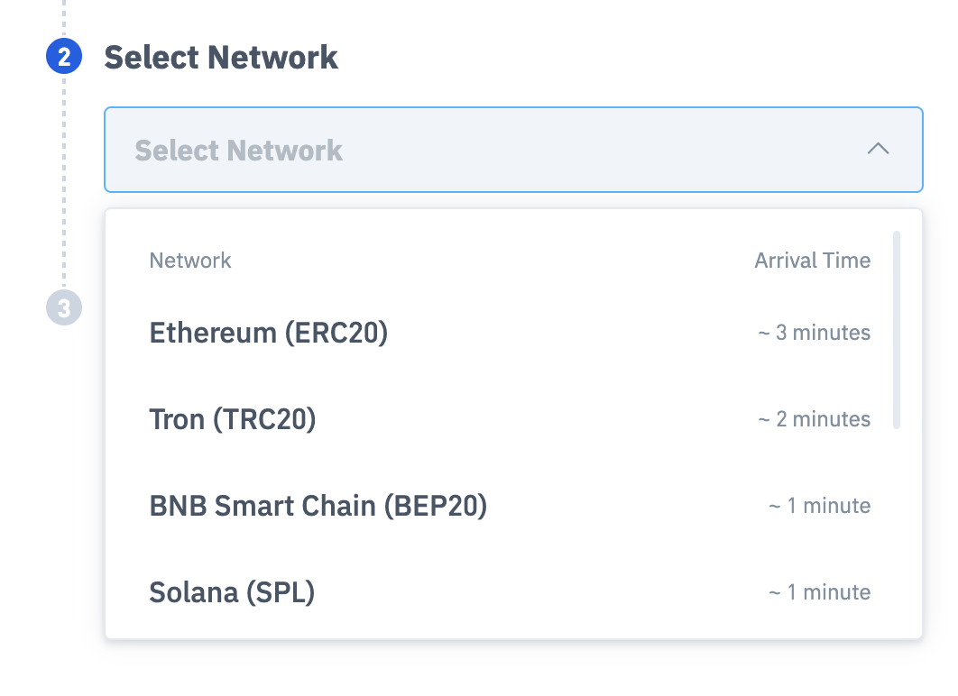 - Choose the correct network for your deposit (e.g. ERC-20, TRC-20, BEP-20).