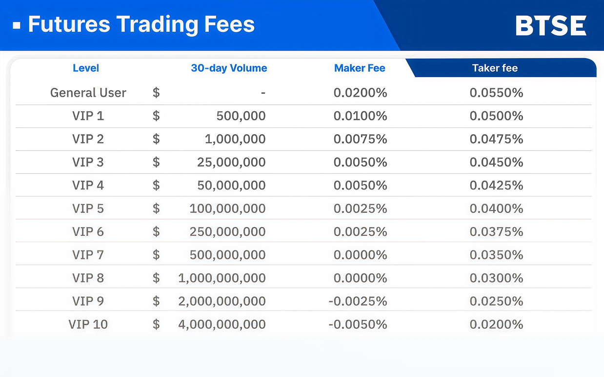 Futures trading enables investors to buy or sell an asset at a predetermined price in the future. On BTSE, these trades come with specific fees.