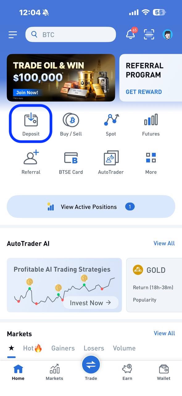 Step 1 — Open the BTSE app and tap Deposit