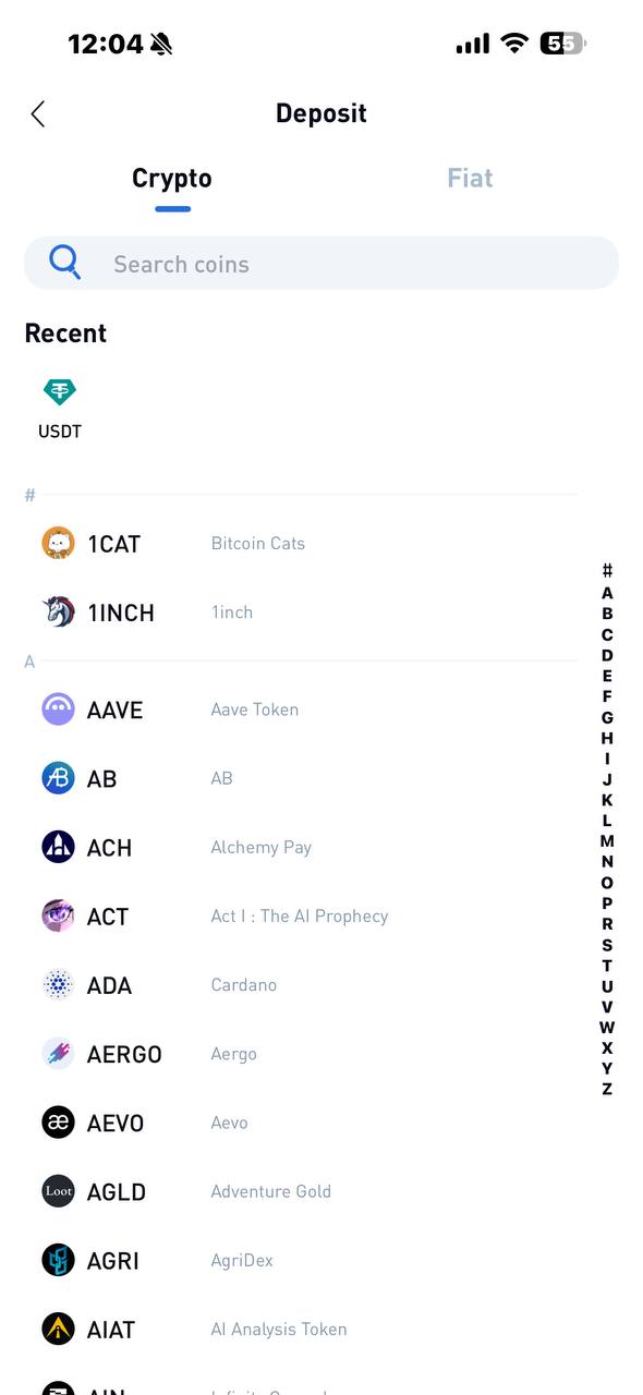 Step 2 — Choose your deposit type: select Crypto for cryptocurrency, and pick the token you want to deposit.