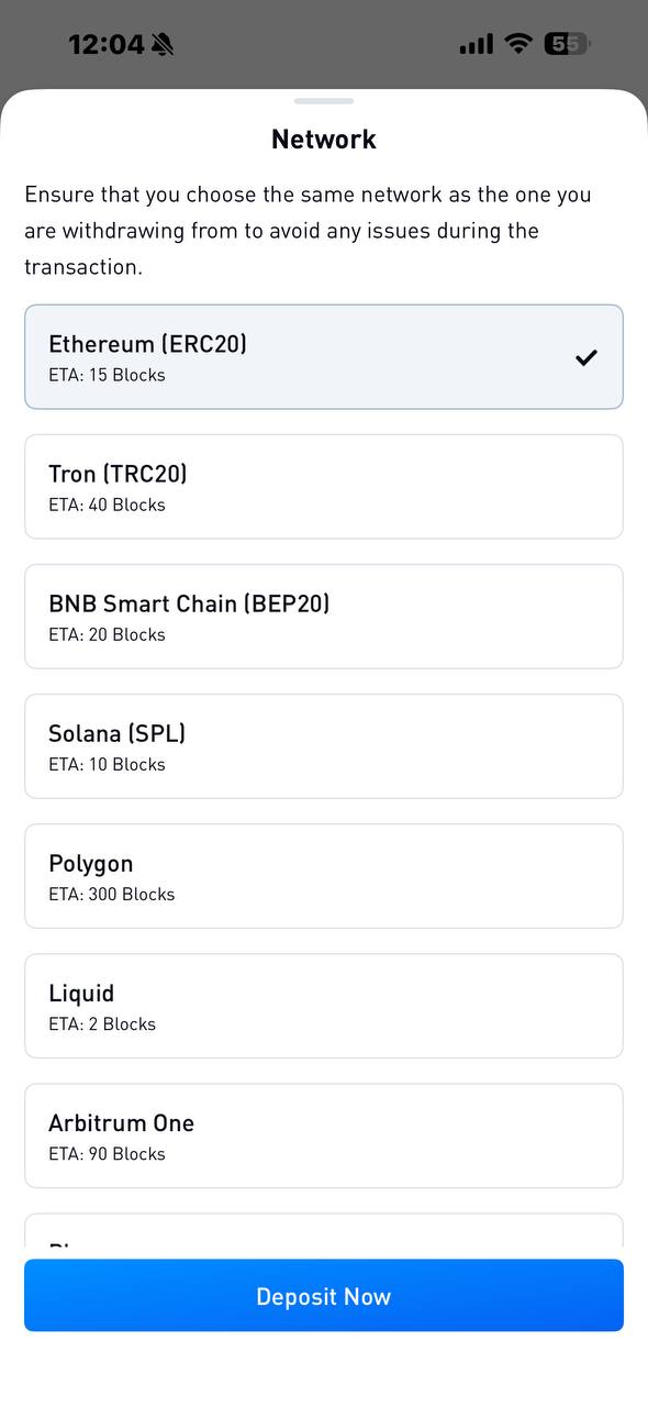 Step 3 — Select a network. Make sure this matches the network you're sending from in your external wallet — if unsure, check there first before continuing