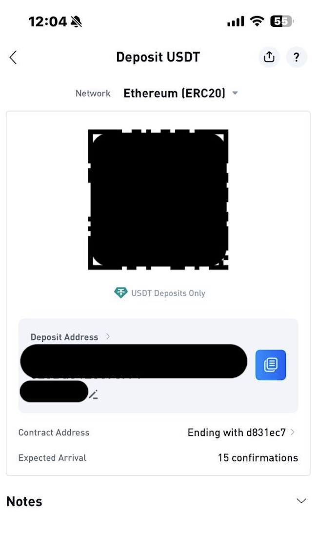 Step 4 — Review your deposit details, including your wallet address and QR code. Read any warnings on this screen carefully