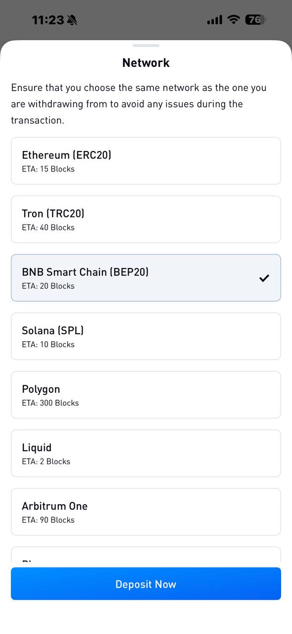 2. Select the token and network you want to deposit