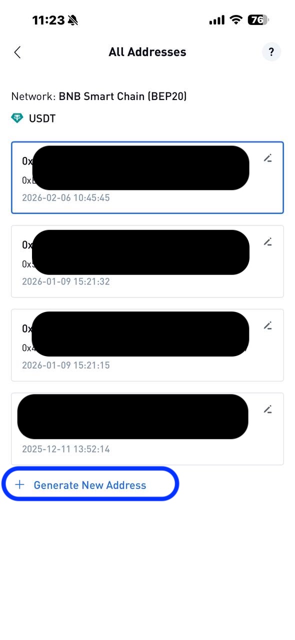 4. After selecting "Deposit Address", you can manage the existing deposit addresses created or generate a new address to create one instantly. You will see up to your latest 10 addresses. Tap any address to copy and use it