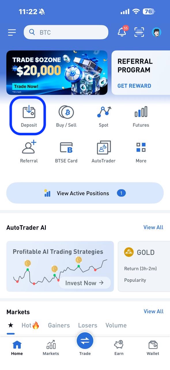 1. Open the BTSE App and go to Deposit