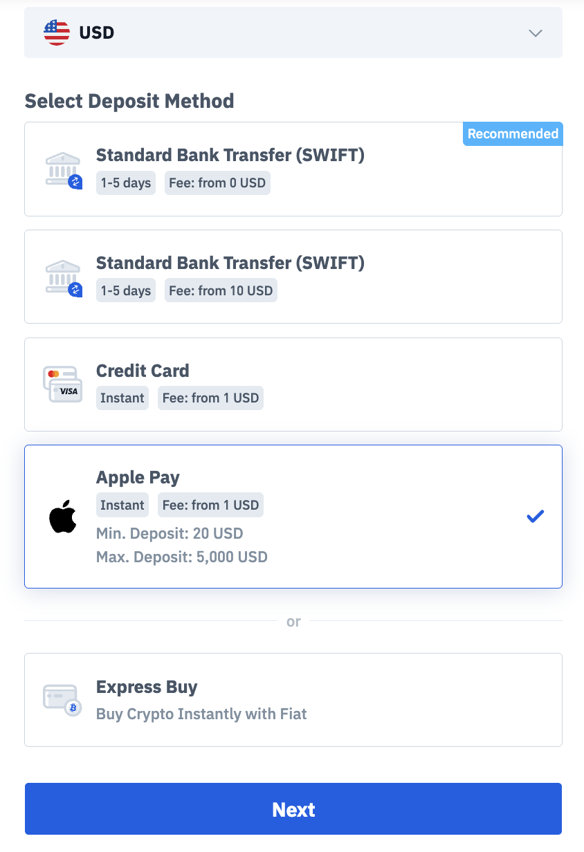 You can deposit fiat currency into your account using Google Pay or Apple Pay. Follow the steps below to get started.