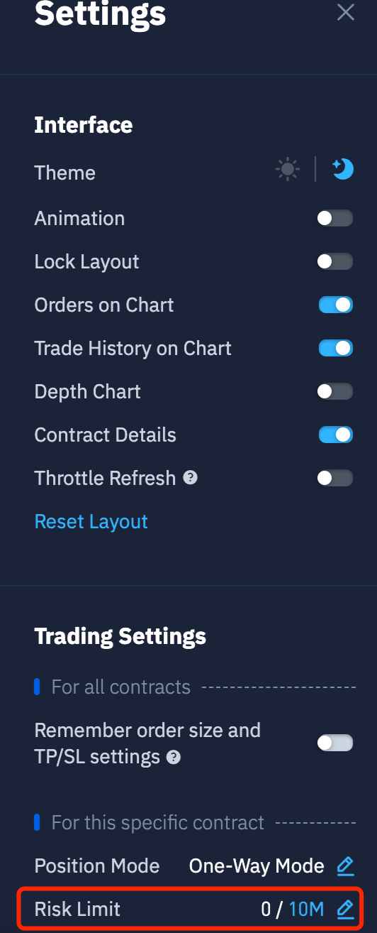 如需调整风险限额,请点击交易页面右上角的设置图标,然后点击风险限额旁的编辑按钮。